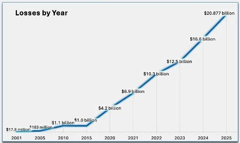 FBI: 20-fold increase in losses reported to the FBI since 2015; reported losses ballooned 26 percent between 2024 and 2025
